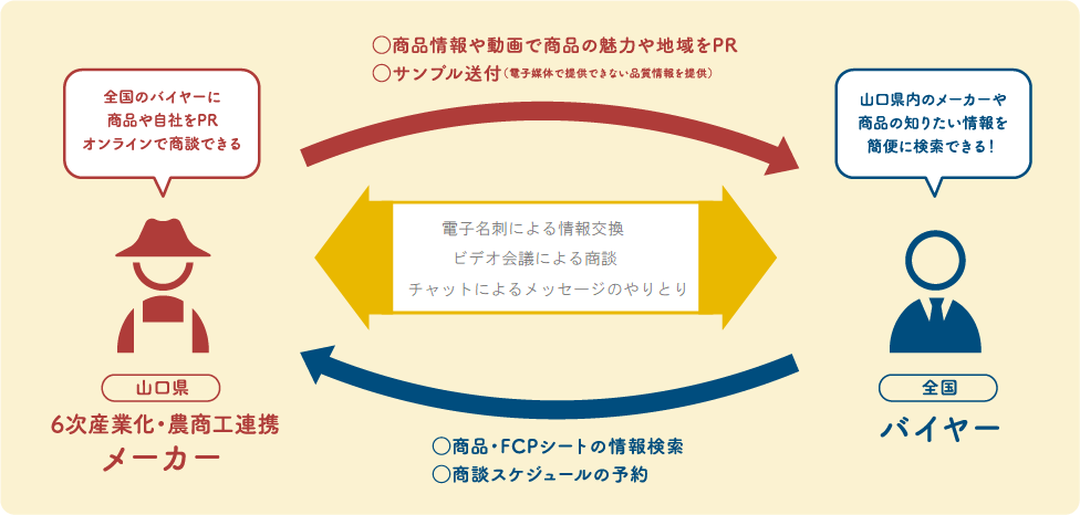 システムを活用した山口県独自のオンライン商談会を定期的に開催し、全国のバイヤーに対する本県6次産業化・農商工連携産品の効果的なPRを行います。